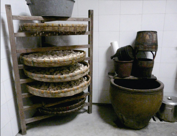 二、發(fā)酵,粉團中合進“老粉”,以釀帶釀。天熱時,置于案板上,蓋薄布片,使其自動發(fā)酵;天泠時,用熱水或火烤,促其發(fā)酵。待粉團溢出一股芬香,方為發(fā)酵成功。