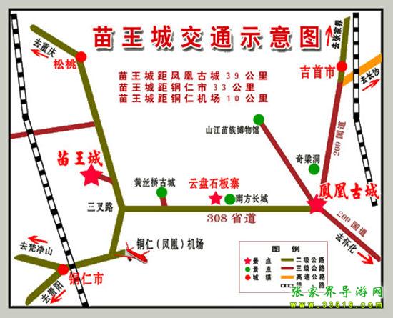 2、銅仁方向:自銅仁火車站往湖南方向經(jīng)過(guò)銅仁鳳凰飛機(jī)場(chǎng)附近(20公里處)、三岔路(23公里處)、蔬菜基地百合基地(26公里處)、中國(guó)苗王城牌樓(30公里處)、苗王茶園(30公里處)、苗王城生態(tài)農(nóng)業(yè)觀光點(diǎn)(桃林、金果林)、苗王城停車場(chǎng)售票處(33公里處)。
