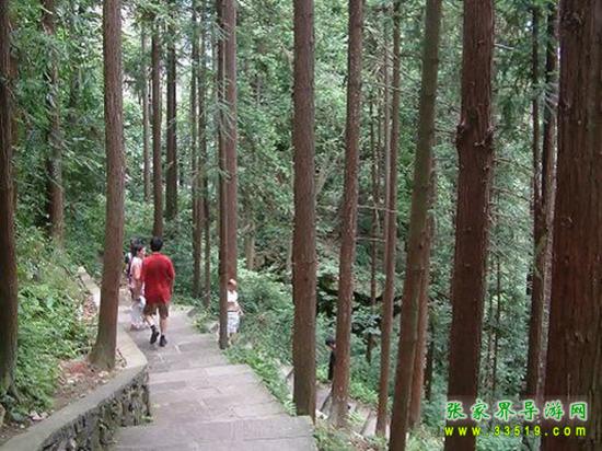 這一大片杉樹林是由張家界國營林場(張家界國家森林公園的前身)工人們種植的。過去“大煉鋼鐵”運(yùn)動,差點把張家界的山頭全部變成了光頭。后來,一些林場工人抱著“頭發(fā)白在張家界,牙齒掉在張家界,死了埋在張家界”的決心,“獻(xiàn)了青春獻(xiàn)終身,獻(xiàn)了終身獻(xiàn)子孫”,發(fā)誓要植樹造林,綠化張家界。幾十年過去了,許多人綠了青山白了頭,他們的心愿終于變成了眼前的現(xiàn)實。腳下這條彎彎曲曲而又平平整整的游道是20世紀(jì)80年代修建的。漫步其上,山風(fēng)陣陣、鳥雀聲聲、奇花朵朵,群峰在樹林中若隱若現(xiàn),很有“蟬鳴林逾靜,鳥鳴山更幽”的幽靜與“采菊東籬下,悠然見南山”的悠然。
