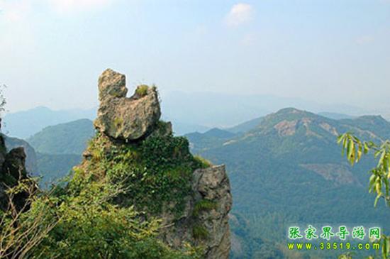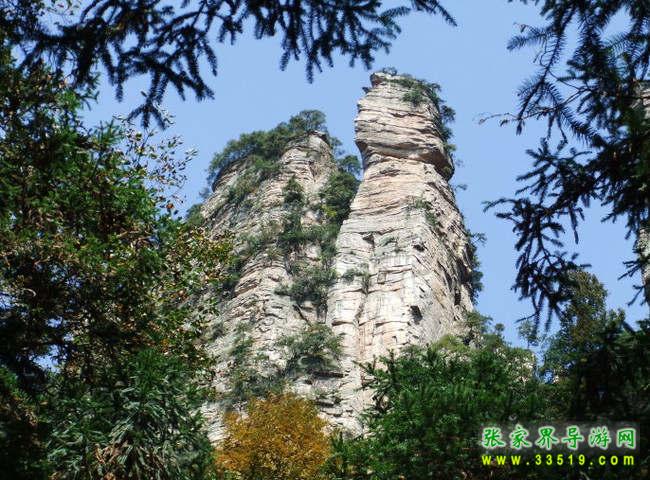 兩支山峰圍成一道天然小石門,大有“一夫當(dāng)關(guān),萬夫莫開”之勢,人稱南天門,據(jù)說過了這道門就是天堂。不過,說來也奇怪,穿過山門之后,山勢為之一變,奇峰怪石,蒼松翠柏,美不勝收,不是天堂,勝似天堂。前面這支位于南天門身邊高200多米的孤立石峰,叫南天一柱。它與一般的山峰不大相同,一般的山峰是下面粗、上面細(xì),而它是上面粗、下面細(xì)。山風(fēng)吹來,這根石柱好像搖搖欲墜,驚心動魄之余,仿佛耳邊還能隱隱約約聽到億萬年前地殼運(yùn)動時發(fā)出的轟隆隆的巨響——為了“安全”我們還是繼續(xù)往前走吧。
