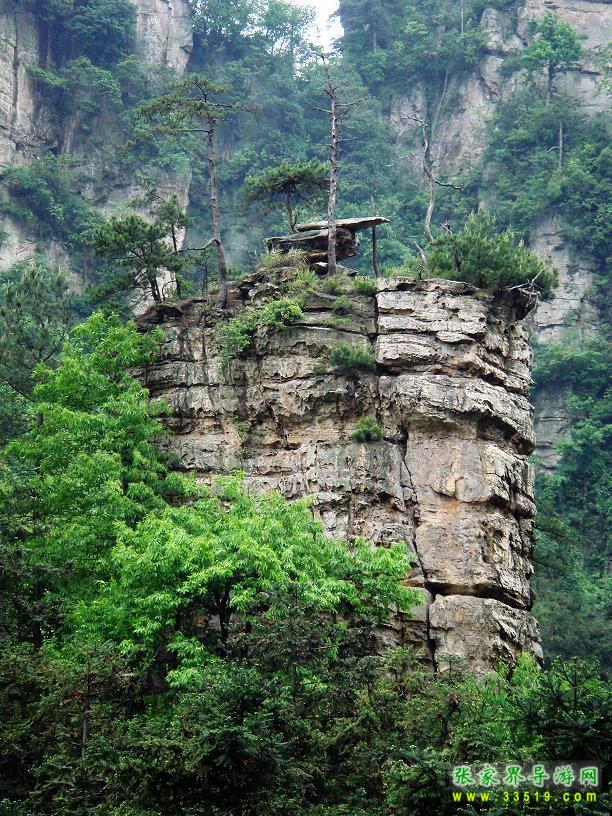這座拔地而起高300多米的巨大山峰,四面絕壁,頂部面積約4公頃,上面長著黑黝黝一大片原始森林。20世紀(jì)70年代,曾有林場工人試圖爬上去考察,但因下雨石滑,無功而返。借助望遠(yuǎn)鏡,可以清楚地看到上面生長的武陵松——說起武陵松(又名巖松),可能沒有黃山松那么出名,但其特色卻絲毫不遜于黃山松,堪稱張家界一絕。有人說:“桂林醉人是漓江清,峨眉風(fēng)流是金頂云,華山險在倚天看,廬山美在泉中聽,不及湘西武陵源,數(shù)千奇峰纏綠云,石上長森林。”“石上長森林”說的就是武陵松。她“千年長不大,萬年長不老”,長在絕頂之上或絕壁之中,不論風(fēng)吹雨打,嚴(yán)寒酷署,總是精神煥發(fā),一看見這瘦小而蒼勁的武陵松,就不由讓人頓生對生命的敬意。