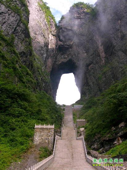 天門洞位于天門山山體的中上部,是世界上最高海拔的天然穿山溶洞,海拔1300米 ,其高131.5米,寬57米 ,深60米。它南北對開于千尋素壁之上,扶搖而通天,似明鏡似天門鑲嵌于蔚蔚天幕之上,終年吞云吐霧,蔚為壯觀中更加神秘莫測。“天門洞開云氣通,江東峨眉皆下風(fēng)”元朝的著名詩人張兌曾這樣贊嘆,磅礴的氣勢由此可見。1700多年來,這一道奇絕天下的勝景吸引著無數(shù)的探訪者趨之若騖。特別是在1999年,世界特技飛行大師架機穿越天門洞,在全球引發(fā)了轟動效應(yīng),收看現(xiàn)場直播的觀眾達到8億之多。