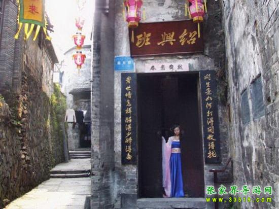 紹興班,位于余家沖,系清代青樓。 始建于清咸豐末年(1860年),是一座四周用封火墻圍護(hù)的木質(zhì)穿斗式的結(jié)構(gòu)建筑,單檐重層,兩進(jìn)三層,各層樓道封閉,分隔有致。各房間置有暗門。具有極其隱蔽的行業(yè)特征。面闊較寬。有濕天井和干天井兩個。通風(fēng)采光效果較佳。木窗均有雕花,且式樣各異。地面分別用青石板和杉木板鋪就,房間屋面均用洪油漆刷,整體形態(tài)完好。近作局部保護(hù)性維修;增添了相關(guān)實物布置和表演節(jié)目,對游客開放。