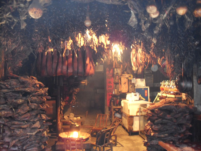 如果你想品嘗正宗的煙熏臘肉,還非得在張家界景區(qū)內(nèi)吃。在景區(qū)內(nèi)當(dāng)?shù)厝碎_的小飯館里可以吃到被炭火烤得烏黑的香噴噴的臘肉,只要把外層洗掉就行了。這種臘肉在城里是不可能吃到的,它是在農(nóng)家的灶上慢慢烤出來的。