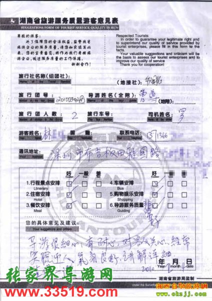 2010年2月4號林小姐一行兩位旅游質(zhì)量反饋